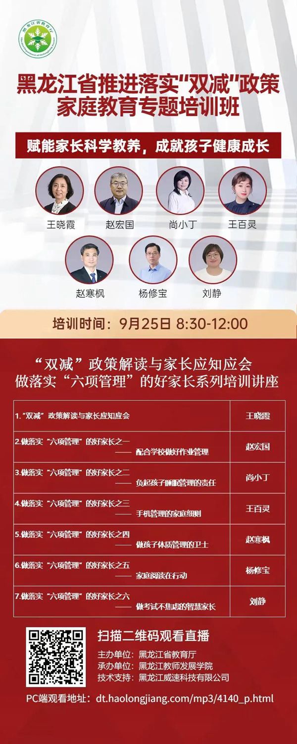 據(jù)了解,此次培訓(xùn)是《黑龍江省中小學(xué)“百萬家庭賦能”工程實(shí)施方案》重要組成部分,也是省教育廳踐行黨史學(xué)習(xí)教育“我為群眾辦實(shí)事”,解決群眾急難愁盼問題的具體舉措,由省教育廳主辦、黑龍江教師發(fā)展學(xué)院承辦,基礎(chǔ)教育處處長領(lǐng)銜六位家庭教育專家共同開講,時(shí)長三個(gè)半小時(shí),受到廣大家長的一致好評(píng),取得良好的社會(huì)反響,直播時(shí)瀏覽峰值達(dá)到210.7萬人次。培訓(xùn)內(nèi)容緊緊圍繞廣大家長們“雙減”形勢下的困惑,深入宣傳“雙減”政策和年初以來教育部相繼下發(fā)的關(guān)于手機(jī)、作業(yè)、睡眠、讀物、體質(zhì)、考試等“六項(xiàng)管理”文件內(nèi)容,分七個(gè)專題進(jìn)行深入細(xì)致的家庭教育指導(dǎo),有的放矢地解答家長“心中所疑”、化解家長“心中所急”,很多家長通過家庭學(xué)校群進(jìn)行交流,有的家長反饋道:“通過觀看直播我們家長深刻體會(huì)到一定要以身作則,在孩子面前少玩手機(jī),多陪孩子閱讀書籍,多讓孩子進(jìn)行戶外活動(dòng)?!庇械募议L則表示,聽了講座深刻理解了孩子成長的根基深植于家庭教育的道理,家庭教育才是孩子的起跑線,主動(dòng)地配合學(xué)校落實(shí)“雙減”政策,從做好“六項(xiàng)管理”入手科學(xué)優(yōu)化家庭教養(yǎng)方式,減少孩子的校外培訓(xùn)和作業(yè)負(fù)擔(dān),還給孩子一個(gè)幸福的童年,做一名智慧家長。