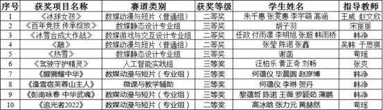 在參賽學(xué)生與指導(dǎo)教師的共同努力下,10項(xiàng)作品進(jìn)入國(guó)賽(包括大數(shù)據(jù)應(yīng)用組、人工智能實(shí)踐組、數(shù)媒動(dòng)漫與短片組、數(shù)媒靜態(tài)設(shè)計(jì)專(zhuān)業(yè)組、微課與教學(xué)輔助組、數(shù)媒游戲與交互設(shè)計(jì)組),最終喜獲全國(guó)二等獎(jiǎng)4項(xiàng),全國(guó)三等獎(jiǎng)6項(xiàng)。