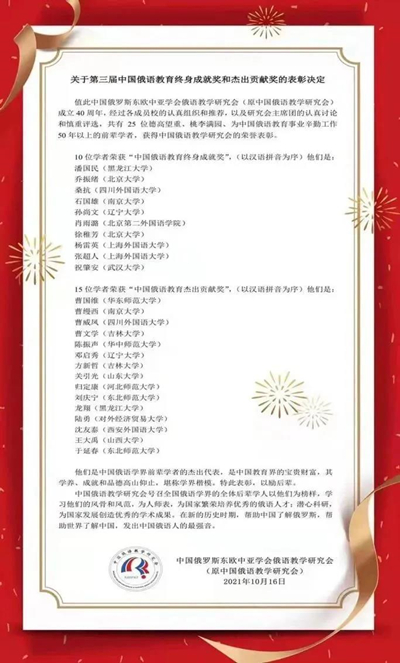 今年恰逢黑龍江大學(xué)建校、黑龍江大學(xué)俄語學(xué)院建院80周年。八十年來,眾多德才兼?zhèn)涞膬?yōu)秀教師為黑大俄語專業(yè)建設(shè)、為中國俄語教育事業(yè)發(fā)展貢獻(xiàn)了畢生力量。李錫胤教授、華劭教授與張家驊教授曾獲“中國俄語教育終身成就獎(jiǎng)”,鄭述譜教授與金亞娜教授曾獲“中國俄語教育杰出貢獻(xiàn)獎(jiǎng)”。此次潘國民教授與龍翔教授榮獲表彰,再次肯定了黑龍江大學(xué)老一輩俄語教師對國家俄語教育事業(yè)發(fā)展做出的突出貢獻(xiàn)。