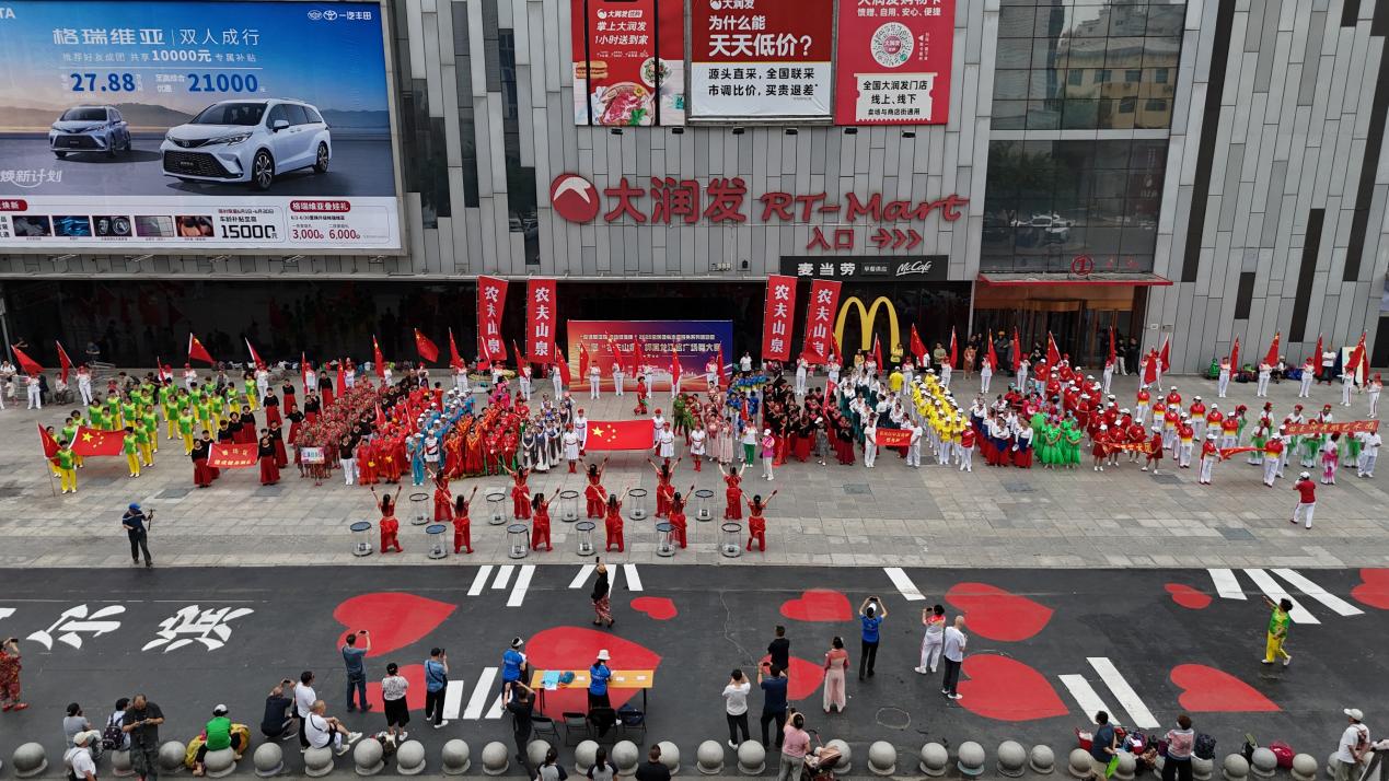 30人鼓樂團(tuán)方陣,精神飽滿閃亮登場(chǎng),瞬間點(diǎn)燃現(xiàn)場(chǎng)氣氛;隨后身穿紅色T恤的百人舞團(tuán),臺(tái)上臺(tái)下同跳《丁香花》,優(yōu)美舞姿展現(xiàn)出濃郁地域文化特色……