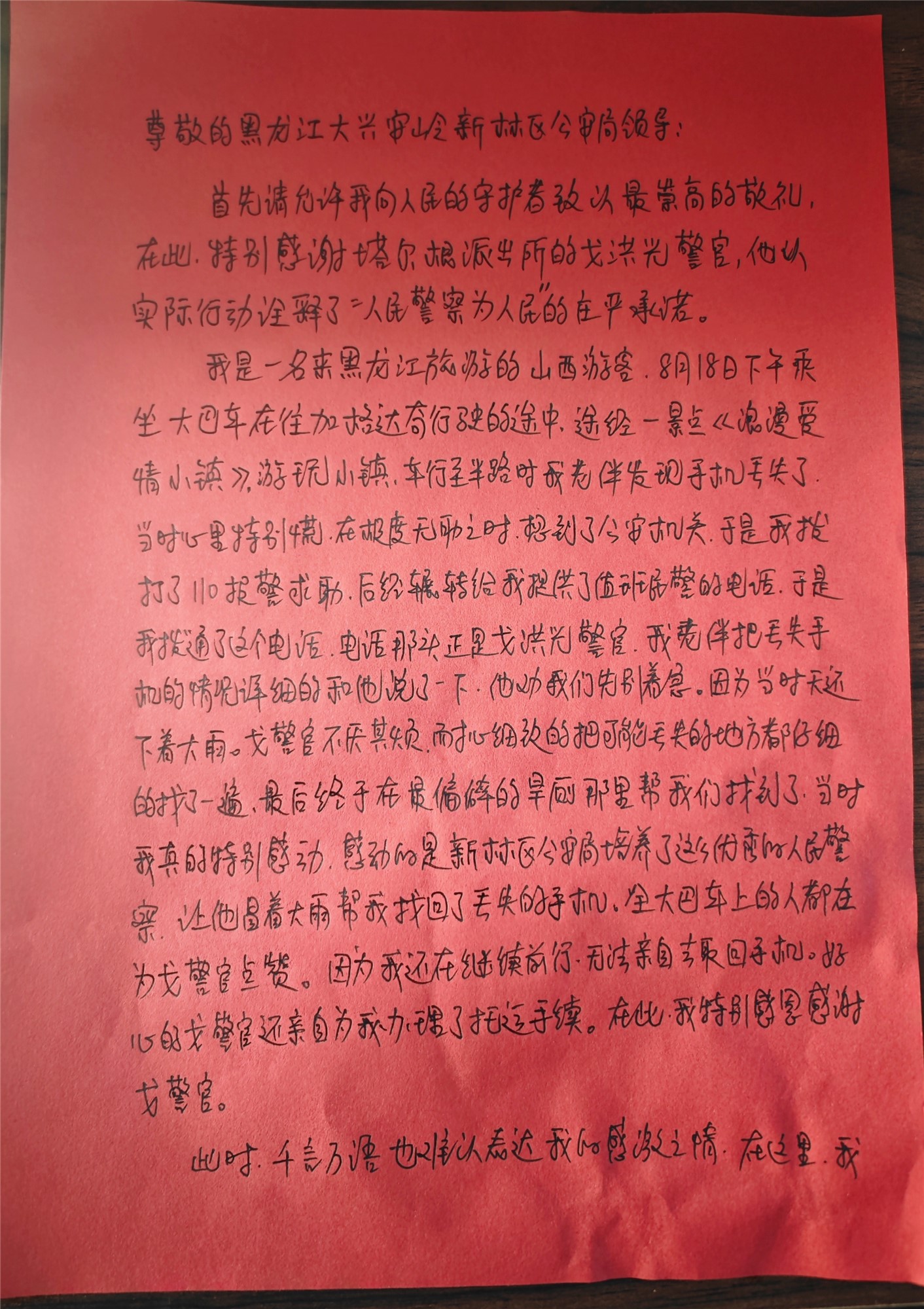 “當(dāng)時(shí)天氣下著大雨,本來(lái)我已經(jīng)不抱希望了,沒(méi)想到警察這么負(fù)責(zé)任地幫我找,千言萬(wàn)語(yǔ)也難以表達(dá)我的感激之情,我和老伴及家人再一次向大興安嶺新林區(qū)公安局表示感謝?!庇慰蜌w家后,始終惦記著這份高效與細(xì)致,親手寫一封感謝信寄到新林區(qū)公安局塔爾根警務(wù)室,對(duì)民警迅速為其找回手機(jī)表示感謝。
