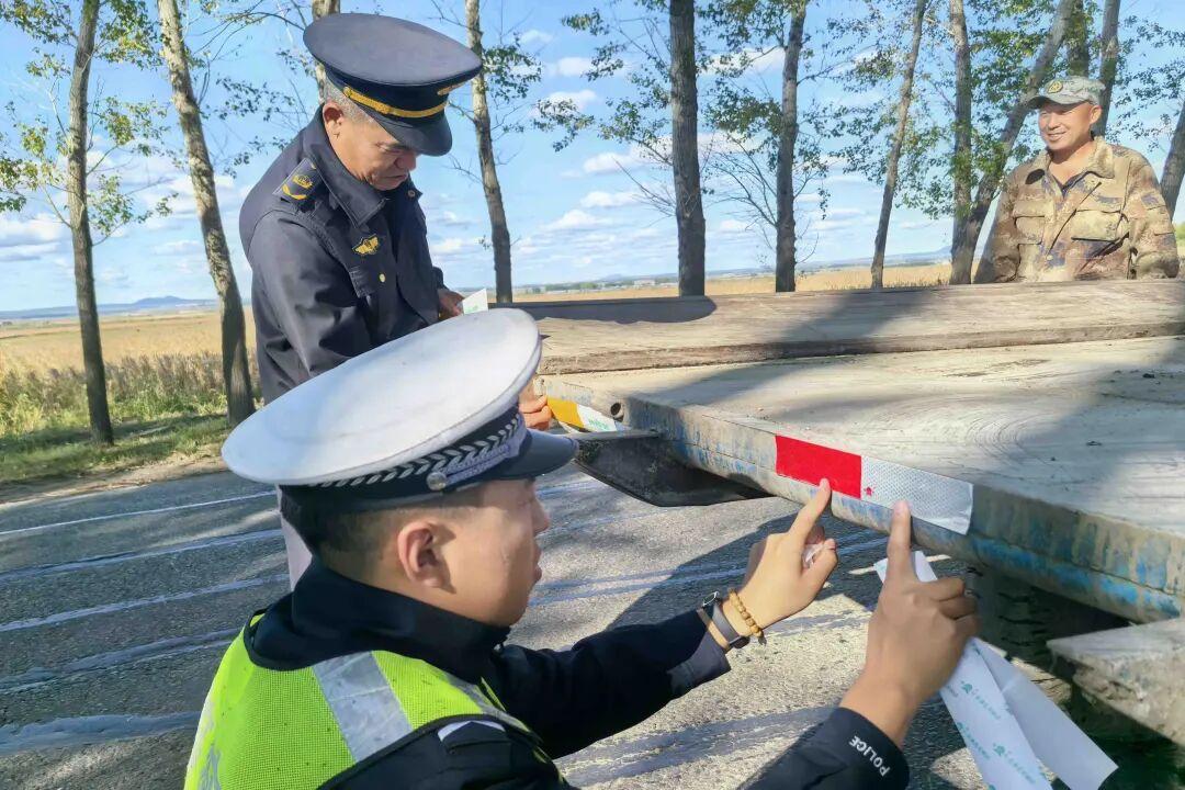 行動中,“警農”聯(lián)合執(zhí)法小組結合轄區(qū)秋收農機出行規(guī)律,在農村主干道、田間出入口等路段設置臨時檢查點,按照“逢車必查、違法必究”的原則,對過往拖拉機、農用車進行逐一檢查,嚴厲打擊無牌無證、酒駕醉駕、違法載人等交通違法行為,形成嚴查、嚴管、嚴處的高壓態(tài)勢,從源頭上預防和減少交通事故。同時,針對秋收期間農用車、農機具夜間作業(yè)頻繁,反光標識缺失易引發(fā)事故的問題,持續(xù)深化“亮尾”行動,對上路行駛的農用車、大型農機具等車身無反光標識、反光標識不清晰不完整的車輛現(xiàn)場免費粘貼反光貼,確保車身側面、尾部關鍵部位反光標識清晰可見,提升夜間行駛辨識度;并向群眾面對面講解農用車違法載人、無牌無證、駕駛報廢車輛上路行駛等交通違法行為的危害性,切實提升安全出行意識和自我保護意識,引導群眾自覺遵守交通法規(guī),養(yǎng)成安全作業(yè)習慣。