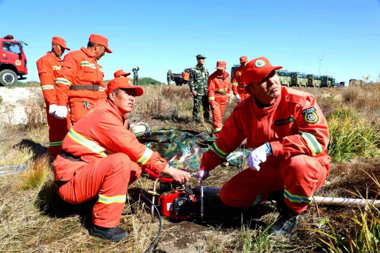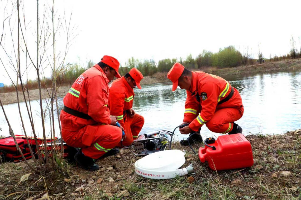 阿木爾林業(yè)局專業(yè)撲火隊(duì)員利用便攜式水泵在水源旁取水(王力 攝)