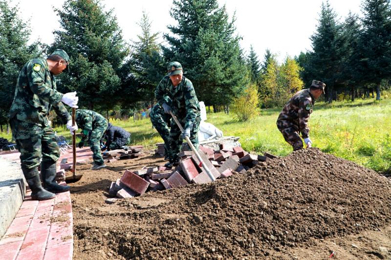施工現(xiàn)場(chǎng)另一邊,林業(yè)局森林消防一大隊(duì)承擔(dān)著北極植物園酒莊大門(mén)步道磚的施工任務(wù)。通往酒莊的道路上,白色線(xiàn)繩將施工區(qū)域切割成規(guī)整的“豆腐塊”,隊(duì)員們?cè)诖蚝盟€(wěn)層的網(wǎng)格區(qū)域內(nèi)精準(zhǔn)作業(yè),確保每一塊步道磚都橫平豎直?!鞍职衷谏巾敳t望,守護(hù)山林,我在山下參與建設(shè),我們父子二人既是建設(shè)者,也是‘森林衛(wèi)士’,以不同的方式守護(hù)著‘美麗阿木爾’”,森防隊(duì)員梁光輝說(shuō)。隊(duì)員們正在參加建設(shè),但森防給養(yǎng)、撲火機(jī)具早已裝車(chē),一旦有火情,便能立刻投入滅火戰(zhàn)斗。