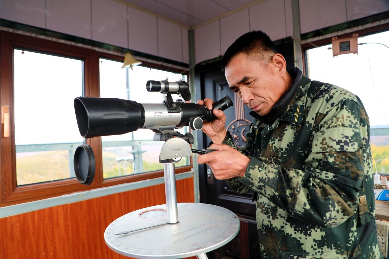 阿木爾林業(yè)局“阿03”塔瞭望員高森林在新建成的塔室內,密切關注周圍森林情況(王力 攝)