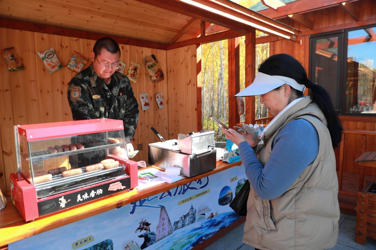 商鋪內(nèi)商品品類豐富多元,從北極冰酒、雪酒等特色酒品,到黑木耳、野生蘑菇、樺樹汁等原生態(tài)林下珍品,再到烤肉等風(fēng)味美食及樺樹皮畫等文創(chuàng)產(chǎn)品,琳瑯滿目的商品精準(zhǔn)契合游客消費(fèi)需求,吸引前往龍江第一灣的游客駐足打卡、體驗消費(fèi)。同時,林業(yè)局從游客需求出發(fā),在商業(yè)區(qū)人性化設(shè)置休息長凳,并依托與伯勒梅里餐廳相鄰的區(qū)位優(yōu)勢,構(gòu)建起“購物+餐飲+歇息+游玩”的一站式服務(wù)體系,進(jìn)一步提升了游客體驗感。