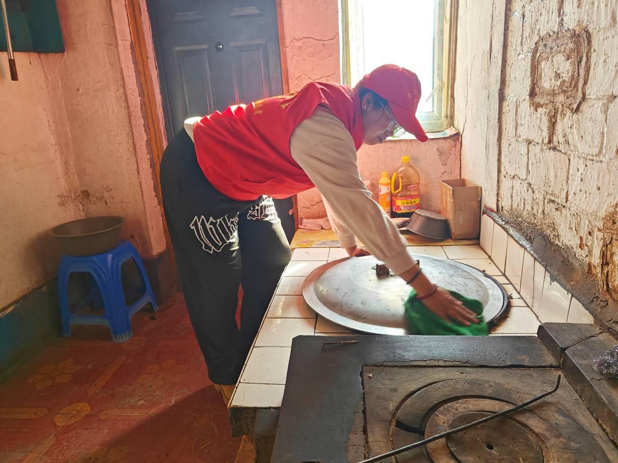 林場志愿者在幫助困難職工打掃衛(wèi)生(朱旭 攝)