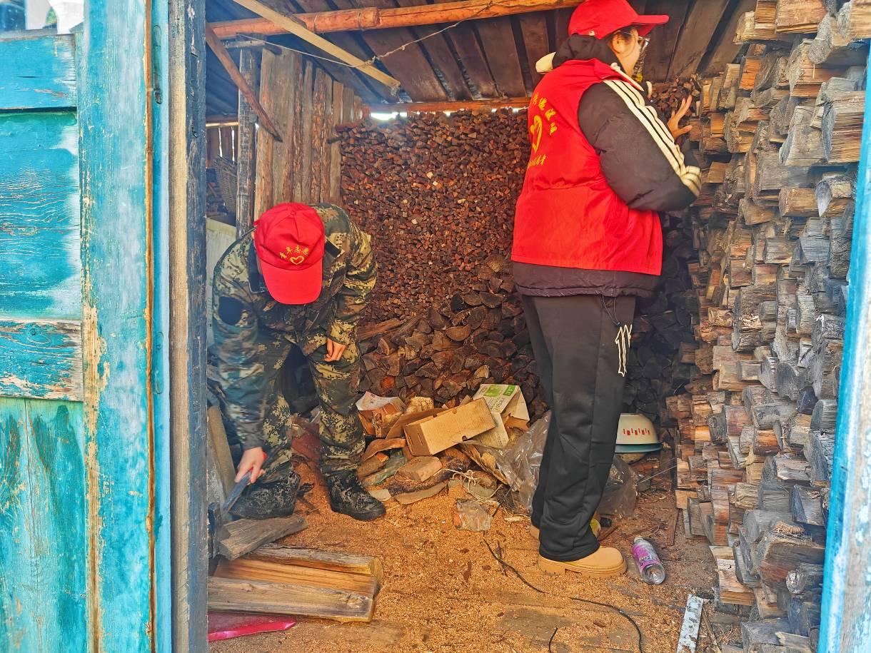 林場志愿者在幫助困難職工整理燒柴(朱旭 攝)