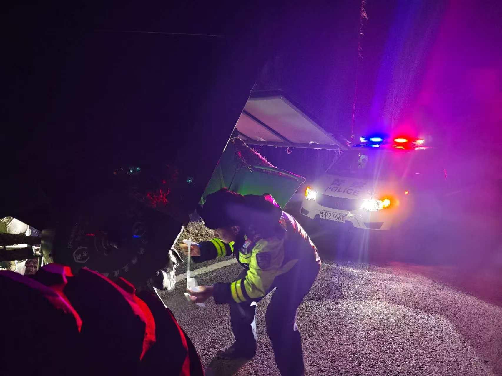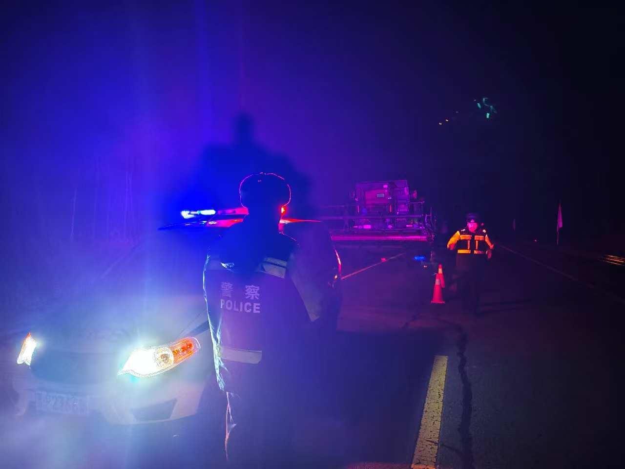 當(dāng)晚,呼瑪縣公安局民警按照日常巡邏部署,穿梭在轄區(qū)的鄉(xiāng)村道路上,守護(hù)著夜間道路的暢通與安全。在巡邏過程中民警發(fā)現(xiàn)一輛收割機(jī)因故障停在道路中間,且未設(shè)置任何警示標(biāo)識,存在重大交通安全隱患。