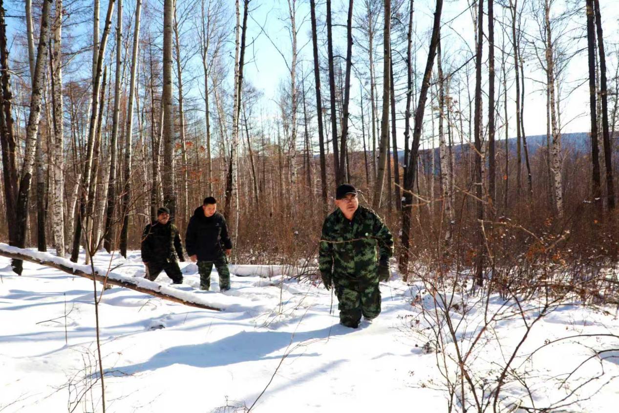阿木爾林業(yè)局產(chǎn)業(yè)發(fā)展科工作人員踏雪前往1—0干線樺樹汁采集地塊,進行踏查(王力 攝)